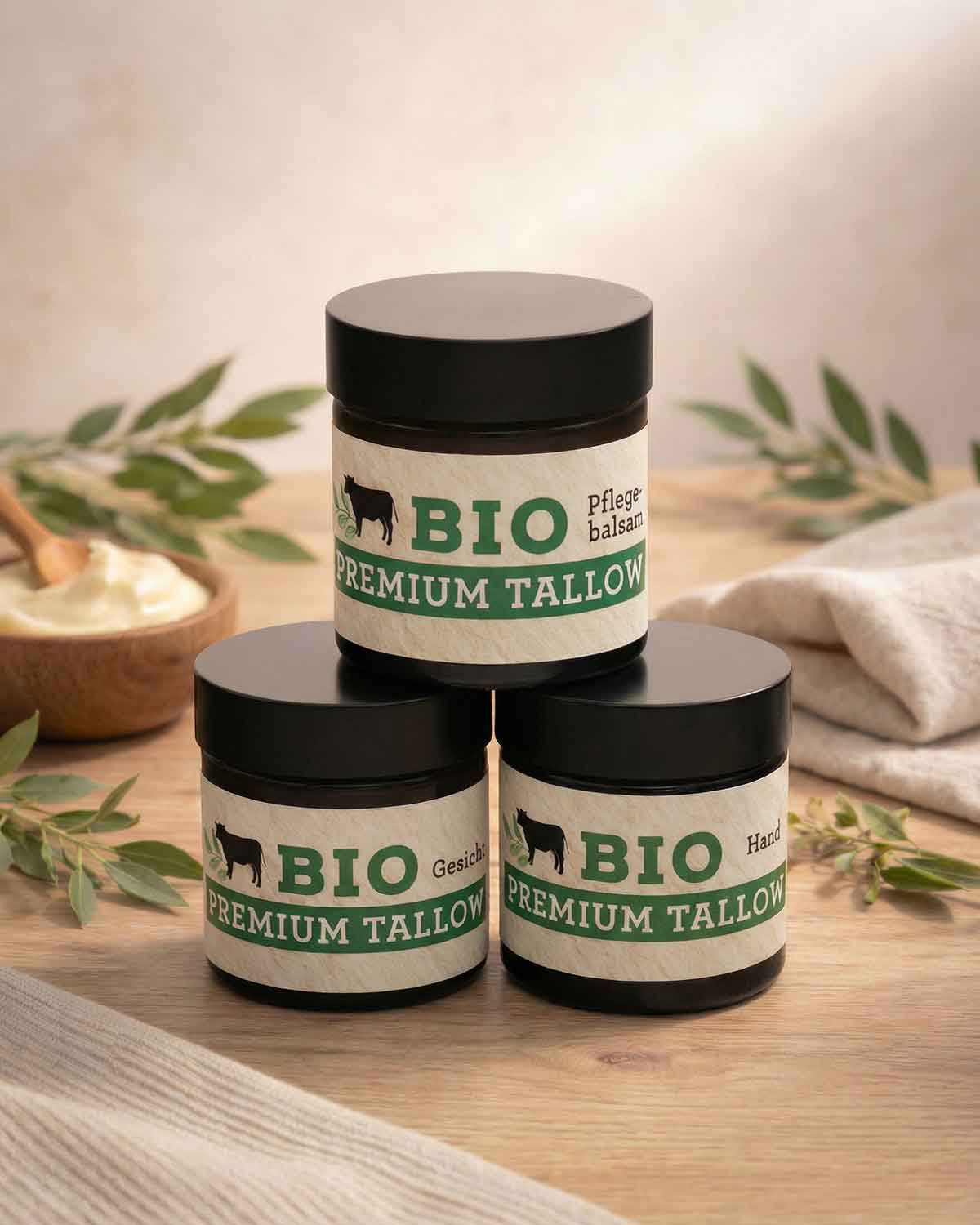 Unser Pflegepaket „Bio Premium Tallow“ vereint drei sorgfältig abgestimmte Pflegeprodukte für die tägliche Pflege. Auf Basis von hochwertigem Bio Rindertalg unterstützen alle drei Produkte die natürliche Hautbarriere und sorgen für ein geschmeidiges, gepflegtes Hautgefühl; reduziert in der Rezeptur, wirksam in der Anwendung.
