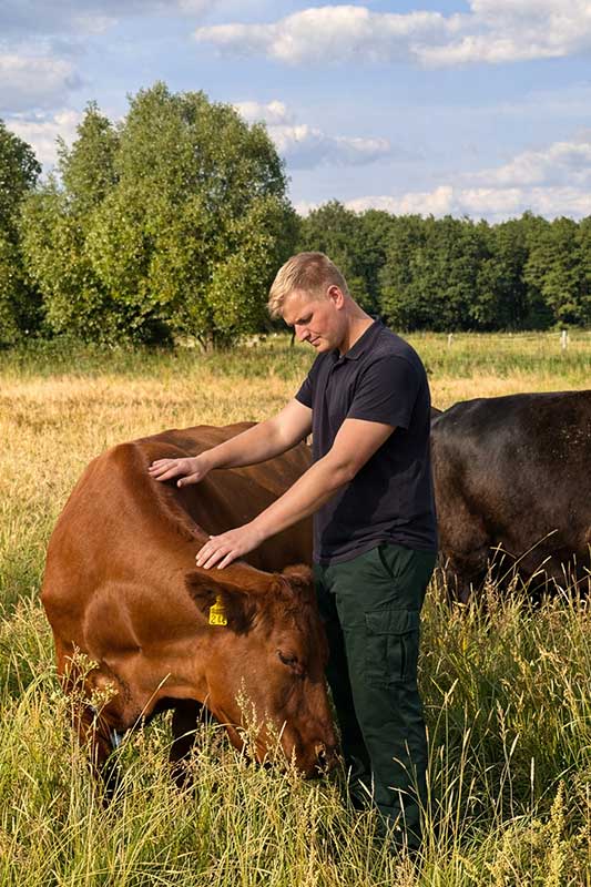 Paul ist seit vielen Jahren liebevoller Züchter von Bio Angus-Rindern. Seine Tiere wachsen ganzjährig auf großen Weideflächen auf – mit frischem Gras, viel Bewegung und Zeit. Für ihn beginnt Qualität schon bei der Haltung und dem Tierwohl. Nur aus diesem Anspruch heraus entsteht der Rohstoff, den Ella für ihre Produkte verwendet: ein außergewöhnlich reiner Bio-Rindertalg.